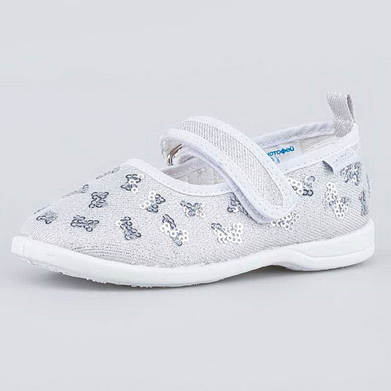 Текстильные туфельки серебристого цвета для девочки Верх выполнен из гипоаллергенного синтетического материала. Подкладка и стелька - из 100% натурального хлопка. Он позволяет ножкам дышать и отводит образующуюся во время носки влагу. Липучки-велькро позволяют быстро обуваться и разуваться. Подошва из ПВХ (поливинилхлорида) - гибкая, легкая и амортизирующая. Обувь украшена пайетками. Модель анатомически правильная: имеет небольшой каблучок/танкетку, подсводник (супинатор), в меру жёсткий задник и круглый носок. Такая научно-обоснованная конструкция положительно влияет на правильное развитие стоп и всего опорно-двигательного аппарата. Сделано в России.